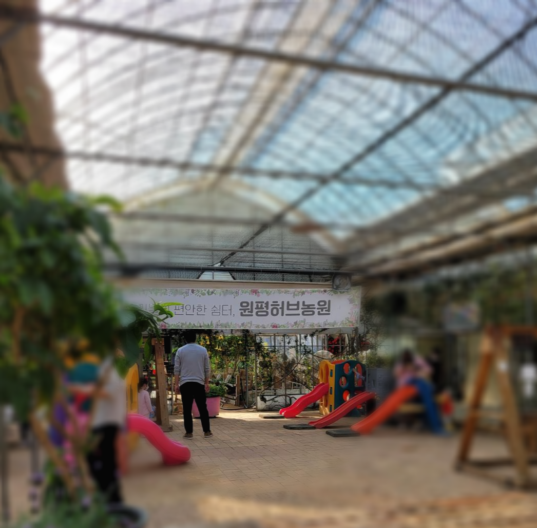 실외에 미세먼지가 매우 심할 때, 비올 때, 그러나 환기가 잘 되는 놀이터를 찾는다면 바로 원평 허브 농원이 딱입니다. 저는 시댁이 매송면이라 자동차로 10분이내로 매우 가까워요. 그 거리적 이점 덕분에 자주 아이와 옵니다. 30분 내지 1시간 정도 놀다오는 데, 갈 때마다 매우 만족스러워요.