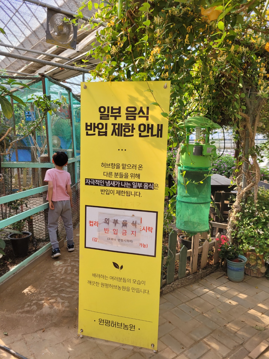 허브 농원에서 아무 것도 먹지 못하는 건 아니에요. 자극적인 음식 제외하고서는 도시락처럼 싸와도 무방합니다. 참 너그럽죠? 대신 쓰레기는 자기가 가져갈 것! 너그러운 원평허브농원이에요 ! 알뜰한 주부님들은 정말 좋아하실 것 같습니다.