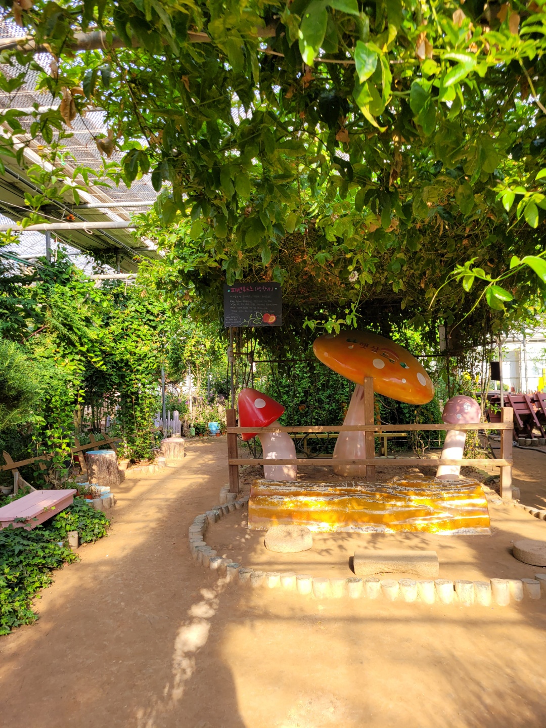 허브 농원 입구 쯤에 예쁜 모형물이 꽤 있습니다. 버섯 모양의 의자에 앉아서 포토타임을 갖는 거죠. 사진 정말 잘 나옵니다.