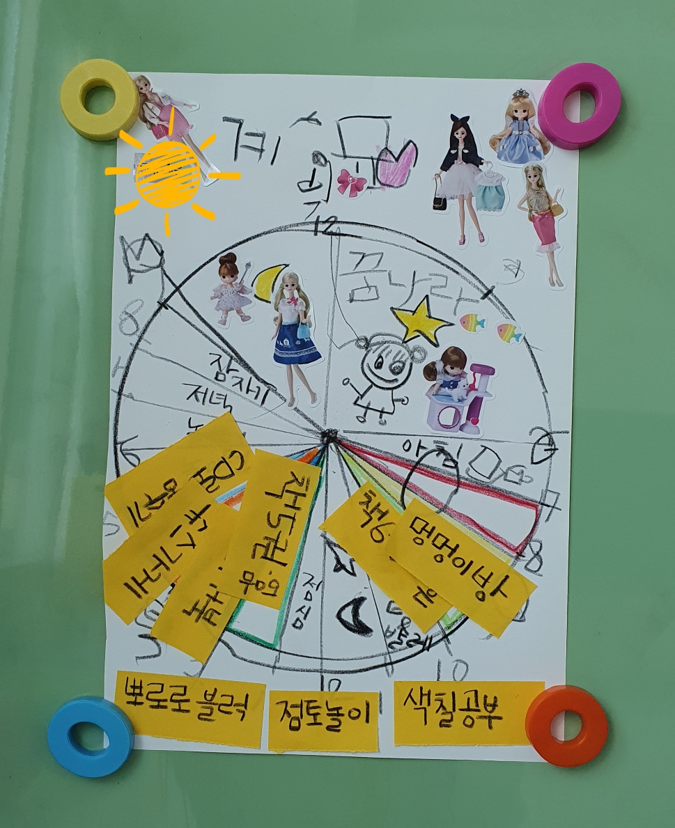 아이들이 방학되면 하루 계획표를 세우죠. 큰 원을 그리고 시간대마다 할 일을 적는 것이죠. 다들 어렸을때, 한번쯤 써보셨죠? 저도 아이와 함께 작성해보기로 했습니다. 아직 한글도 모르고, 시계보는 법도 모르지만, 아이의 의지를 반영해서 하루 계획을 작성하는 겁니다.